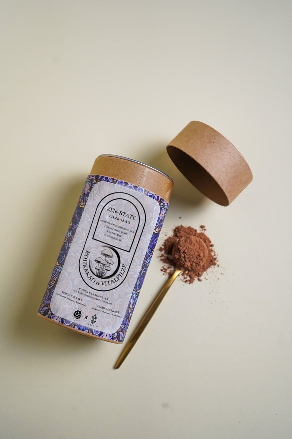 Unser Zen-State Kakao (200g) vereint die Kraft von fermentiertem Rohkakao mit hochwertigen TCM-Pilzextrakten. Die Basis bildet unser beliebter Rohkakao aus Bali, verfeinert mit Chaga (mindestens 2% Triterpene) und Reishi (mindestens 3% Triterpene) – zwei der faszinierendsten Pilze aus der TCM.